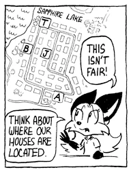 Sapphire Lake is a neighborhood in Gemstone Estates, the primary setting of Precocious. It is the home turf of the main cast: Bud, Autumn, Jacob, and Tiffany. The neighborhood houses the middle class of the Gemstone pack, being wealthier than Emerald Woods but not as wealthy as Diamond Bluffs. Sapphire Lake draws its name from the Gemstone Estates lake, although unfortunately it can only claim half of the actual lake as its own property. The community's soccer field and baseball diamond are located here, leading to Sapphire Lake being the focal point of the baseball team story arc as well as the setting for much of the entire comic itself.